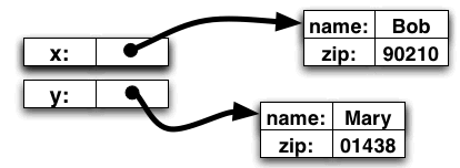 This does have some interesting implications, however. Mainly, it means that you can have many variables that all refer to the same object. If we were to change Bob's zip code to 91234, then it doesn't matter which reference you use to do that — or which reference you use to check the data later. If all references are pointing to the same data, then of course a change made by one of them is immediately visible from all others.