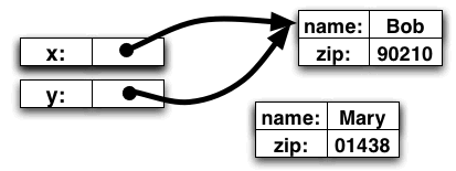 Before, x and y referred to two different objects; after the assignment they refer to the same object. Again, there's nothing mysterious going on; it's just that the value of these variables are references to objects stored somewhere else.